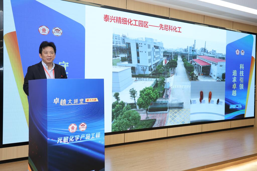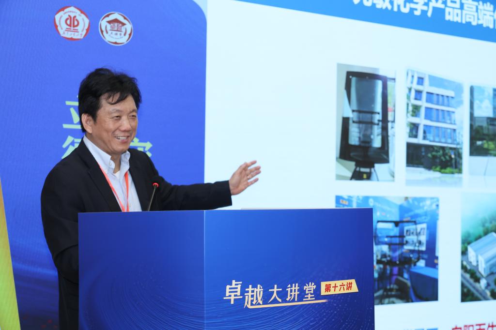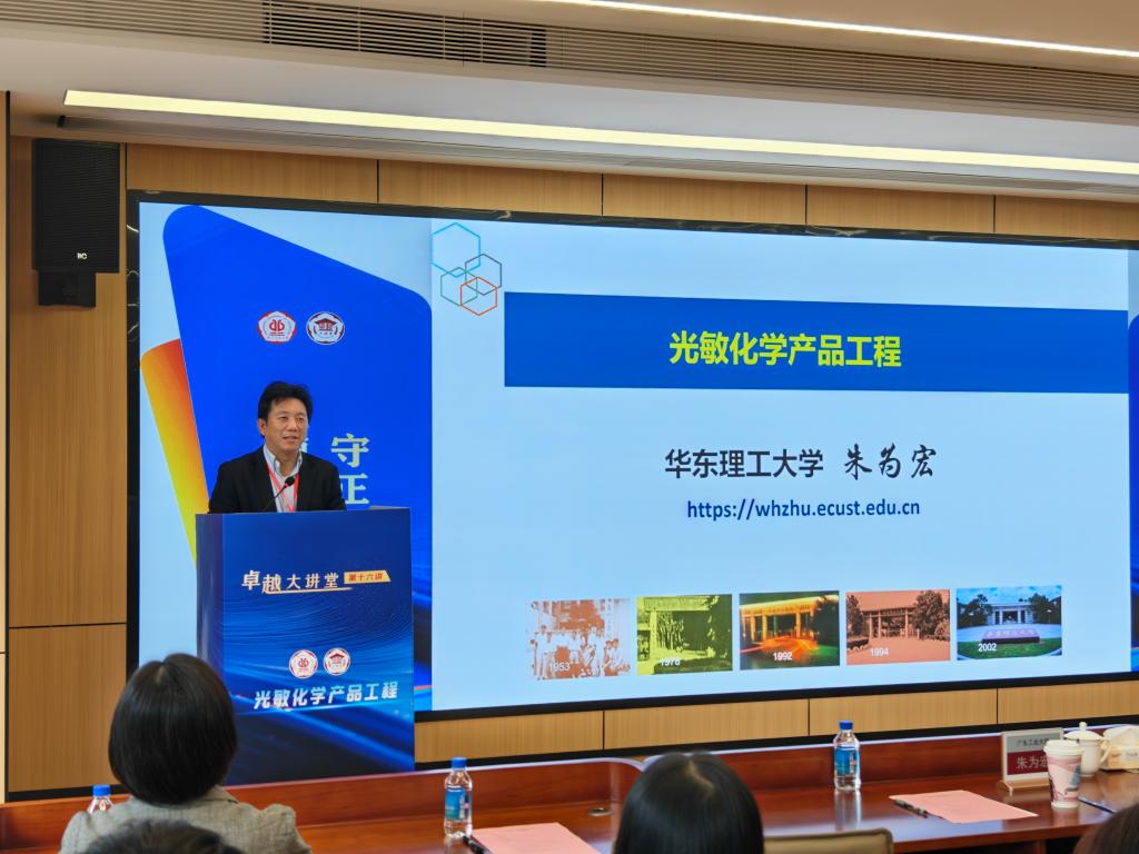讲座上,朱为宏院士系统阐述了光敏化学这一化工新范式具有非接触、高精准、低功耗等独特优势,并重点分享了团队在三个层面的创新成果:在基础研究方面,提出染料第二排液模型,开发双亲性共聚物材料,突破有机半导体迁移率瓶颈;在过程强化方面,采用多通道涡流设备和AI高通量筛选,实现材料形貌精准控制和研发效率提升;在产品应用方面,开发出光致变色分子、新型防伪技术、智能节能玻璃等高端产品。