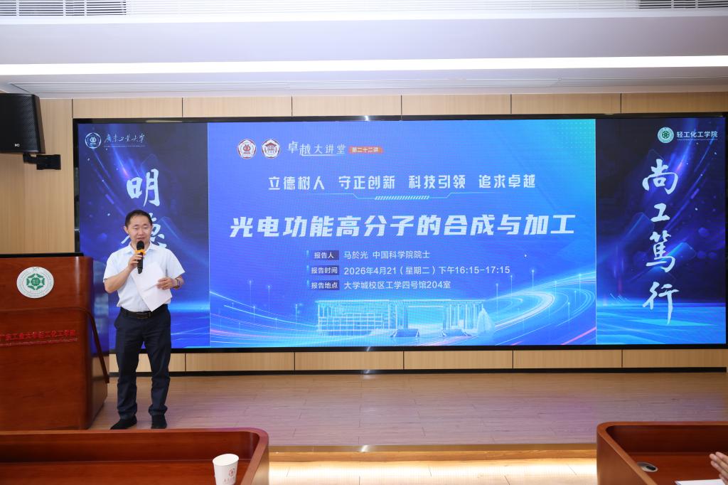 4月21日下午,中国科学院院士、华南理工大学教授马於光做客广东工业大学“卓越大讲堂”第二十二讲,并以“光电功能高分子的合成与加工”为主题,奉献了一场精彩的学术报告。本场报告由科技处秦延林副处长主持,人事处籍少敏副处长、分析测试中心霍延平主任、轻工化工学院副院长何军以及副书记杨刚等师生代表超过150人聆听报告。
